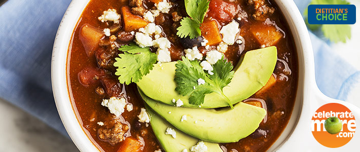 Beefy Sweet Potato and Black Bean Chili is a nutritious way to warm yourself up on a cold day without slowing you down.