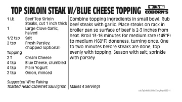Top Sirloin Steak With Blue Cheese Topping Published January 27, 2012 at 360 × 203 in Top Sirloin Steak With Blue Cheese Topping Click here to view in a new window